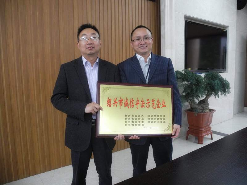 公司一貫堅(jiān)持誠實(shí)守信,依法經(jīng)營原則,經(jīng)紹興市普法辦、紹興市經(jīng)信委、紹興市司法局、紹興市環(huán)保局、紹興市國資委、紹興市工商局、紹興市質(zhì)監(jiān)局等7家部門聯(lián)合評審,2013年11月被評定為紹興市“誠信守法示范企業(yè)”。